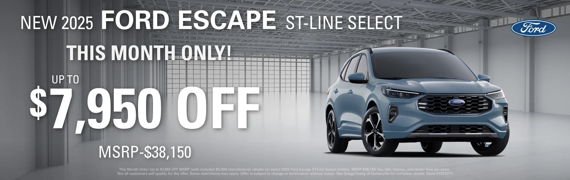 Receive $4,000 in Retail Customer Cash on all New In-Stock '25 Ford Escapes. This promotion offers $4,000 Retail Customer Cash on all in-stock new 2025 Ford Escape models. Total savings may be up to $5,500 off MSRP with the included Retail Customer Cash. Tax, title, license, and dealer fees are additional. Not all customers will qualify, and some restrictions may apply. This offer is subject to change or termination without notice. See Gregg Young of Hortonville for details.